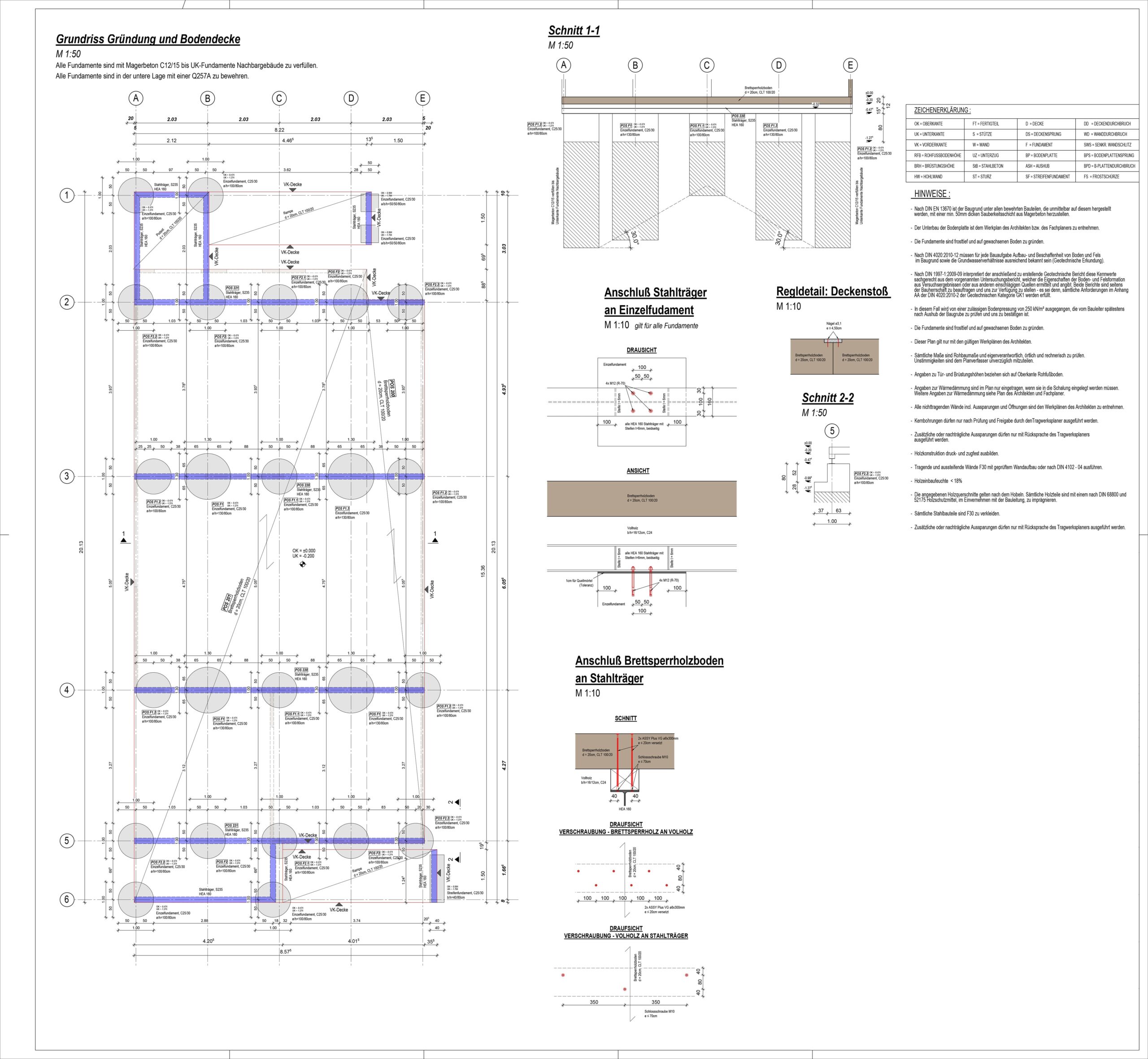 On behalf of our partner structural-engineering company from Germany, foundation plans, along with detailed plans featuring timber cross-sections, for a baby-daycare center were drawn up. The entire structure of the building is constructed in modern skeletal timber construction, with foundations on point foundations (partially deep foundations) and steel beams.
