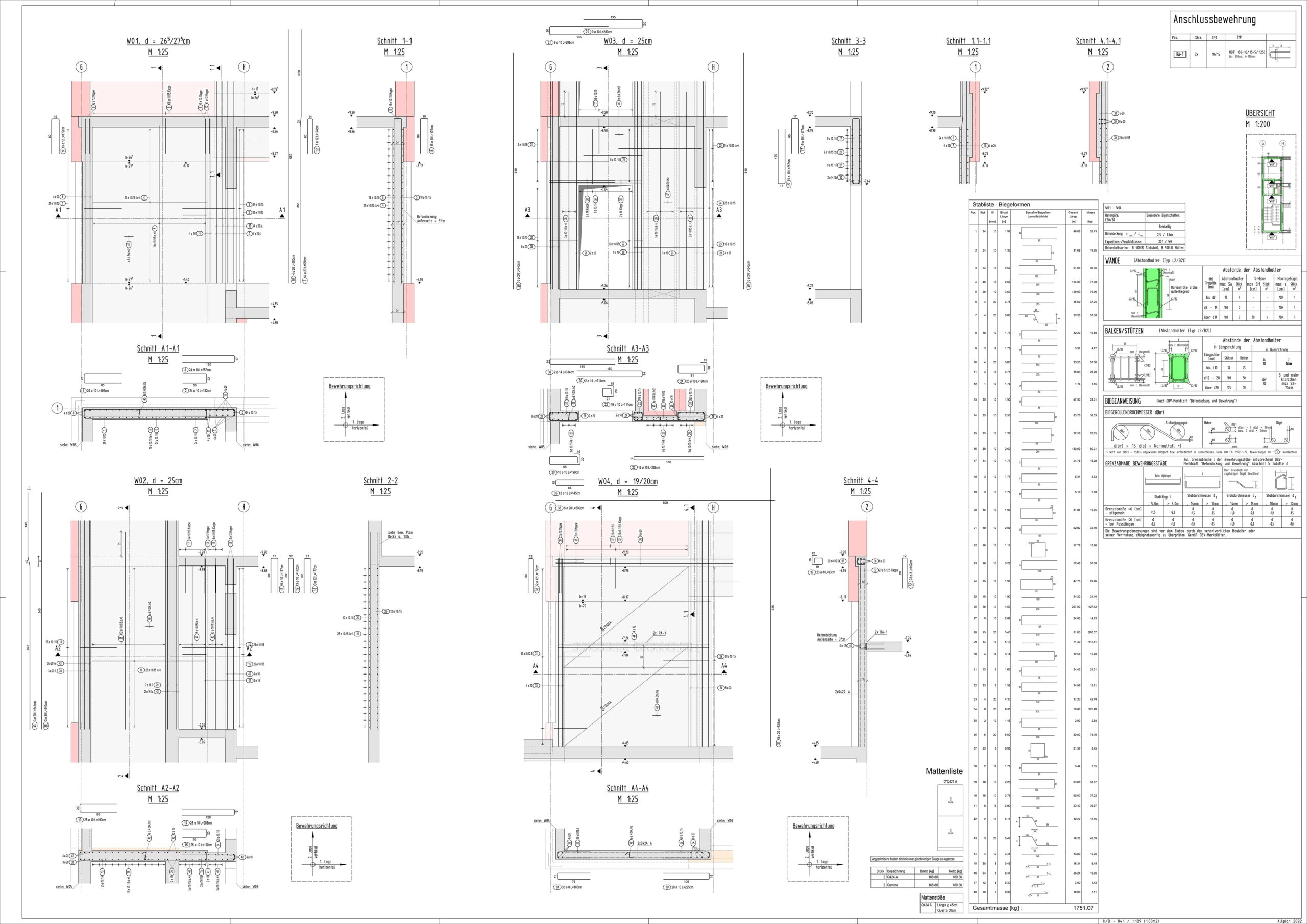 The reinforcement plans for a mixed-use building complex were developed on behalf of our partner structural-engineering planner from Germany. The lower three floors are partially built underground, owing to the building’s location on a relatively steep slope. The structure encompasses rental apartments, a kindergarten, a community center, and a supermarket.
